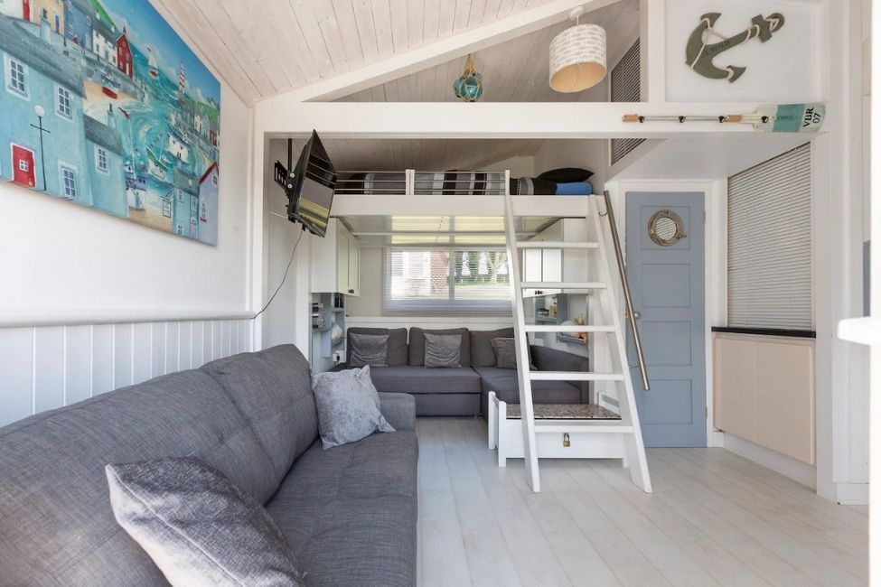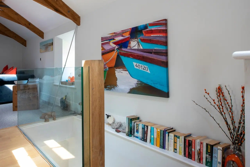 The main sleeping area is on a mezzanine level above the sitting/kitchen area with restricted head height – please see images. Alternative sleeping is on sofa beds on the ground floor